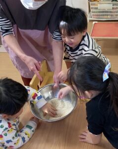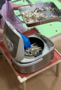「今日は旬のきのこを使ってきのこおにぎりを作りましょう!」「きのこは3種類使いま~す」